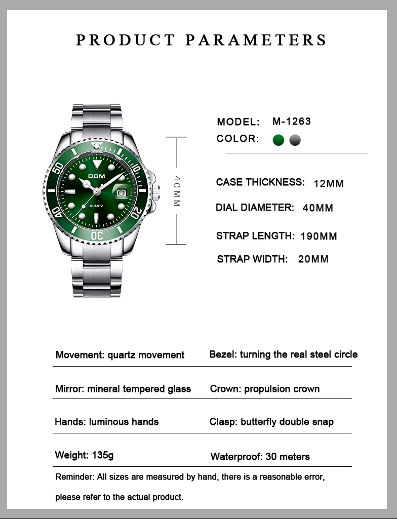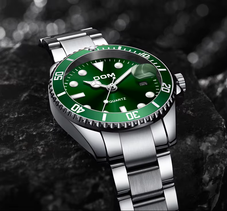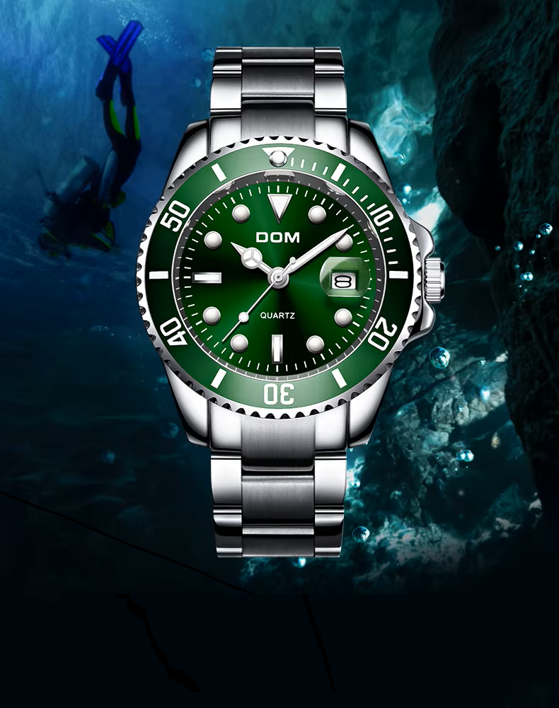 Elevate your wristwear with the DOM Men’s Luxury Quartz Watch—crafted for style, durability, and precision. Featuring a bold green dial, luminous hands, and a rotating bezel, this timepiece blends sport utility with refined elegance. Whether you’re navigating daily meetings or weekend adventures, its 30-meter water resistance and mineral-reinforced glass lens ensure reliability in any setting.