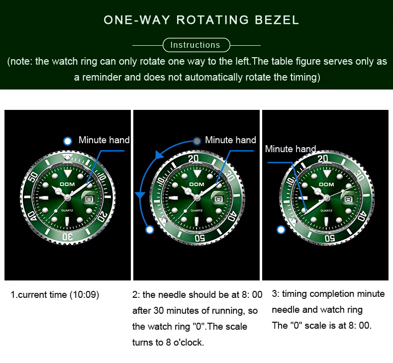 • ✅ Bezel: Stainless steel, unidirectional rotating with minute markers