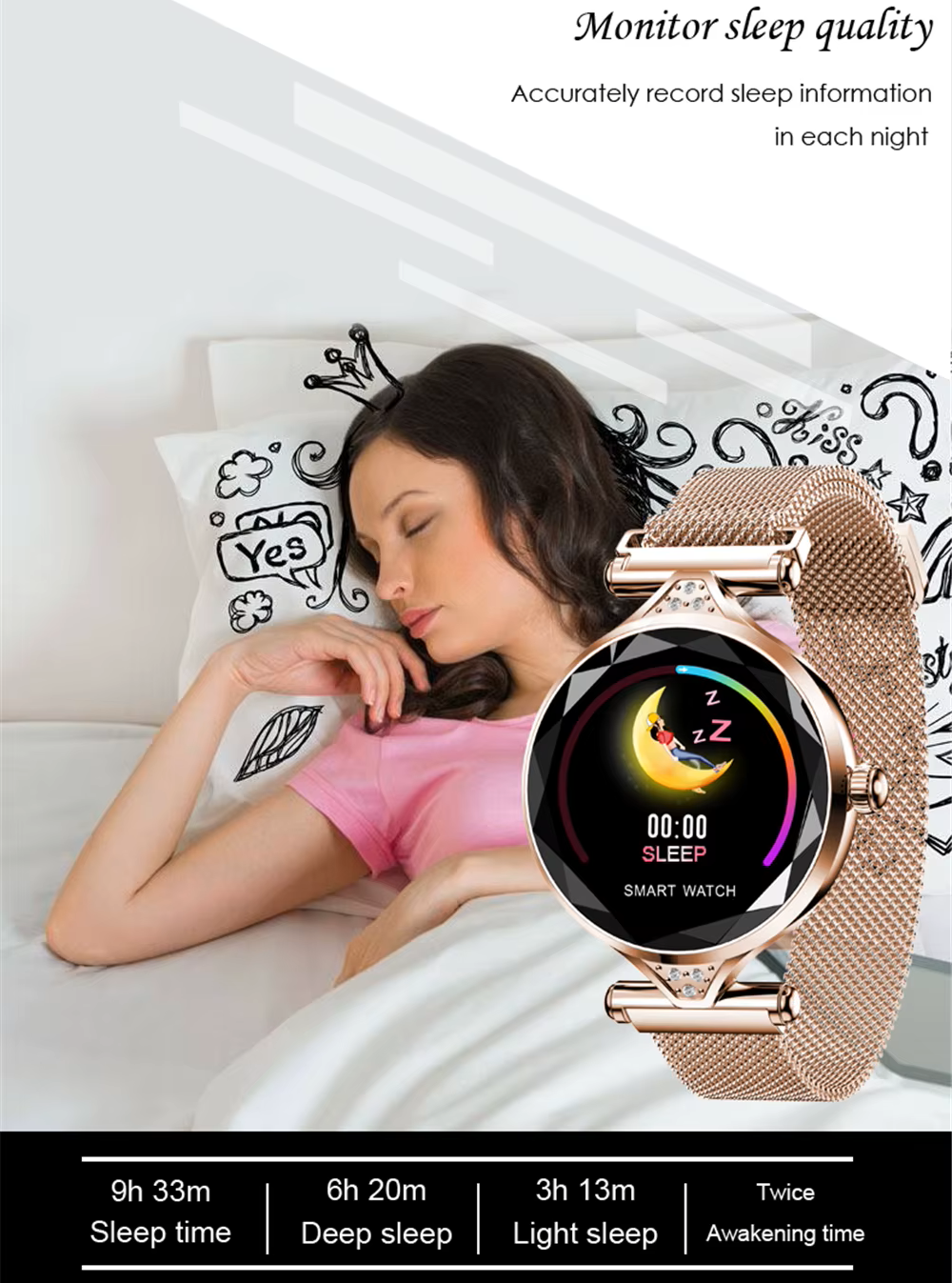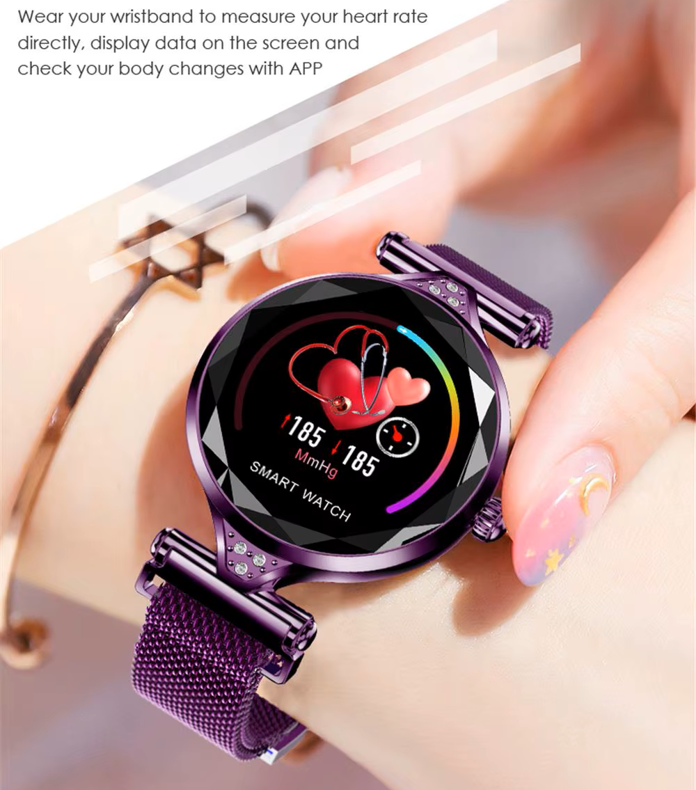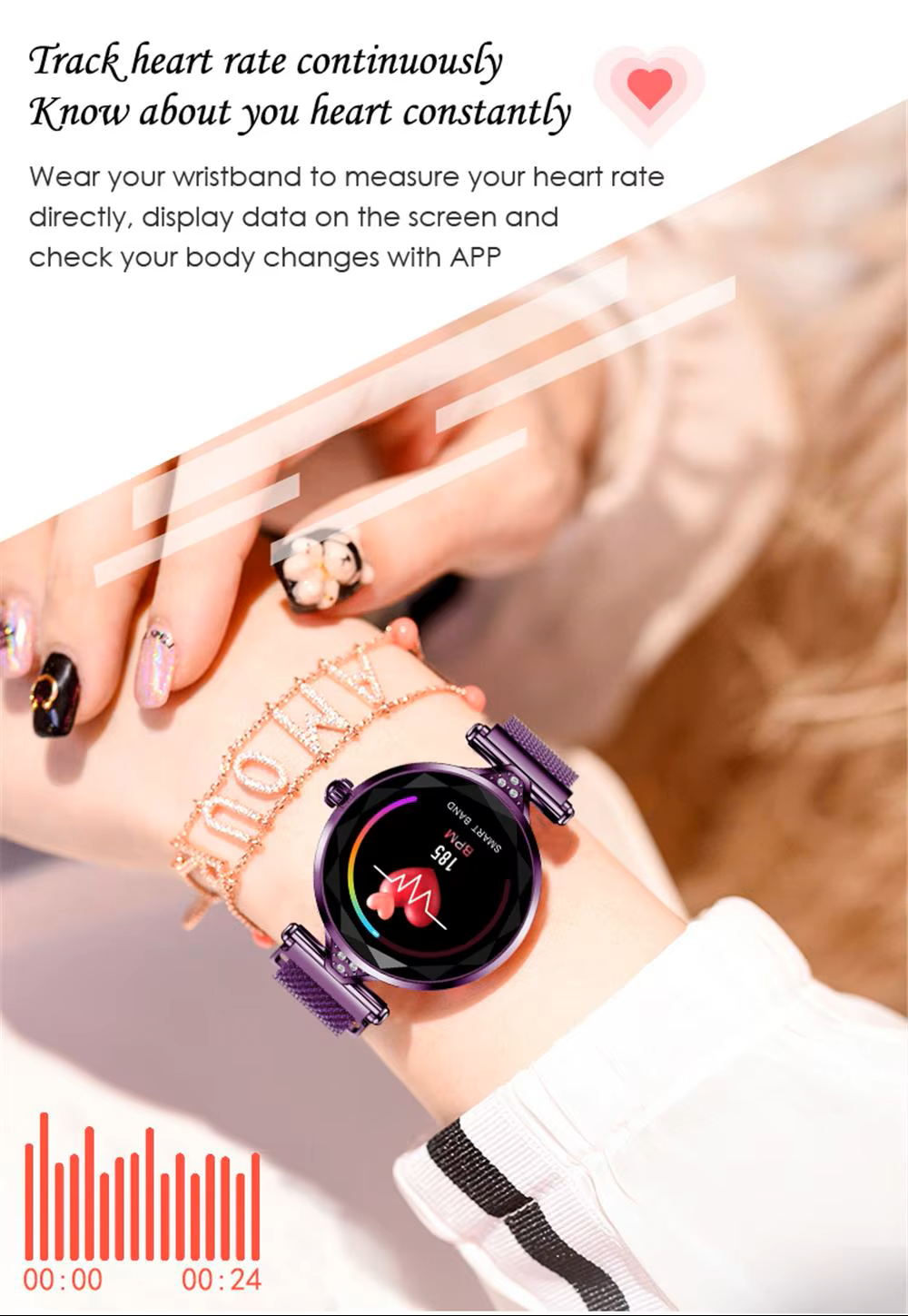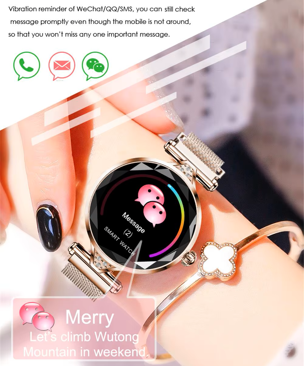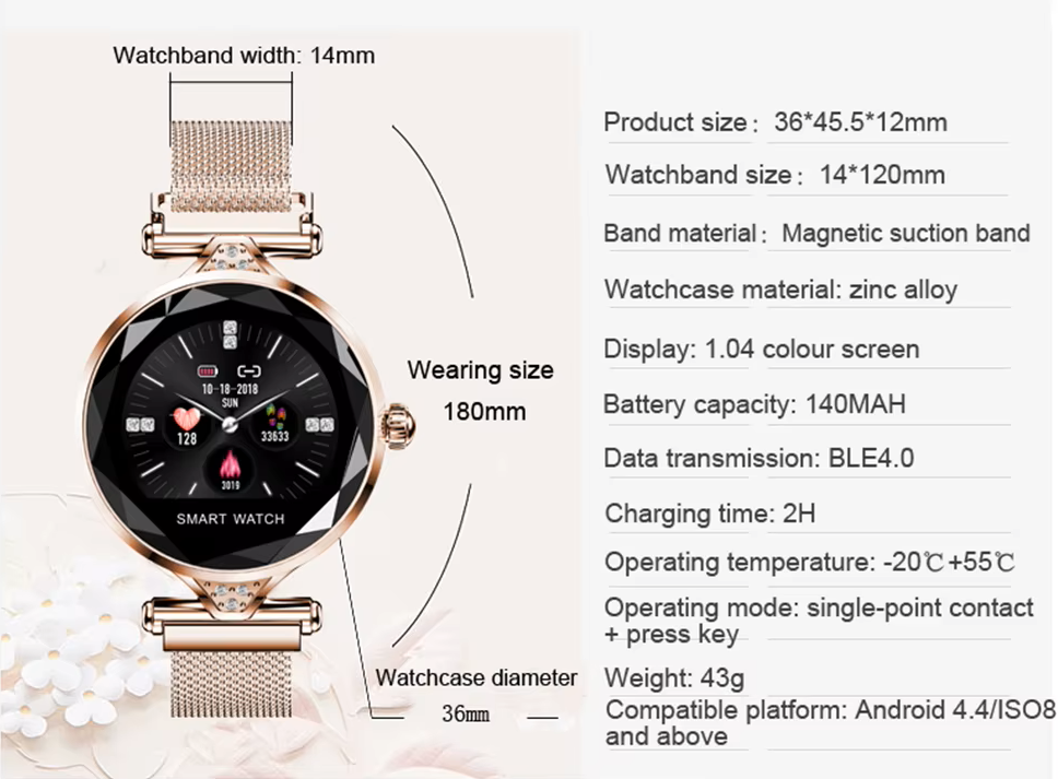 Elegant design meets intelligent health tracking with the H1 Women’s Smart Watch. Featuring a dazzling diamond-accented flower interface and a vibrant 1.04″ color screen, this fashionable wearable blends beauty with performance. Whether you’re monitoring your heart rate, tracking your sleep, or staying connected with message alerts, the H1 keeps you informed and in style.