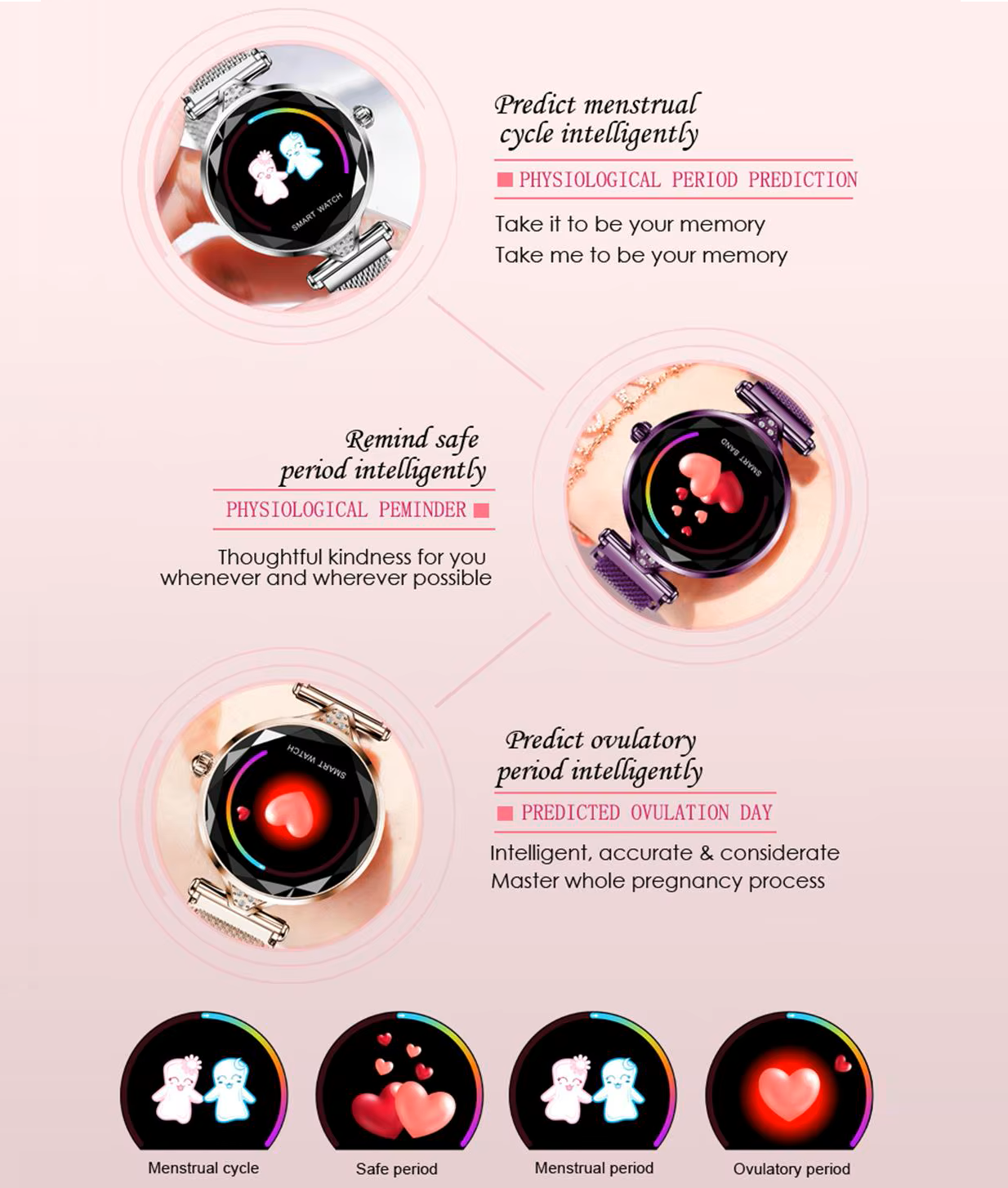 - Health Monitoring – Real-time heart rate, blood pressure, sleep quality, and menstrual cycle prediction