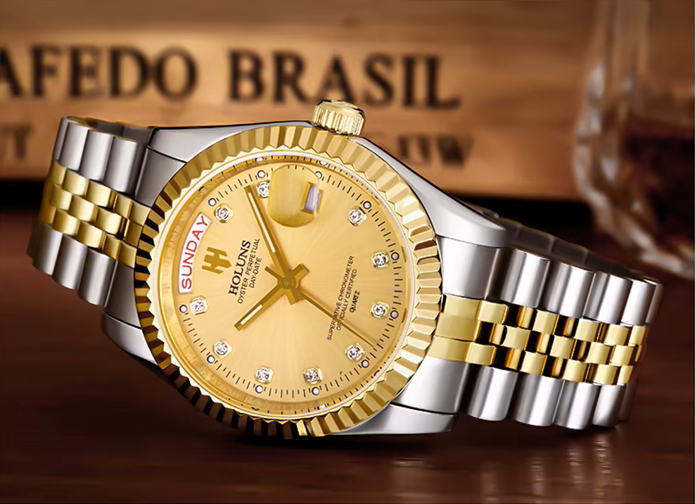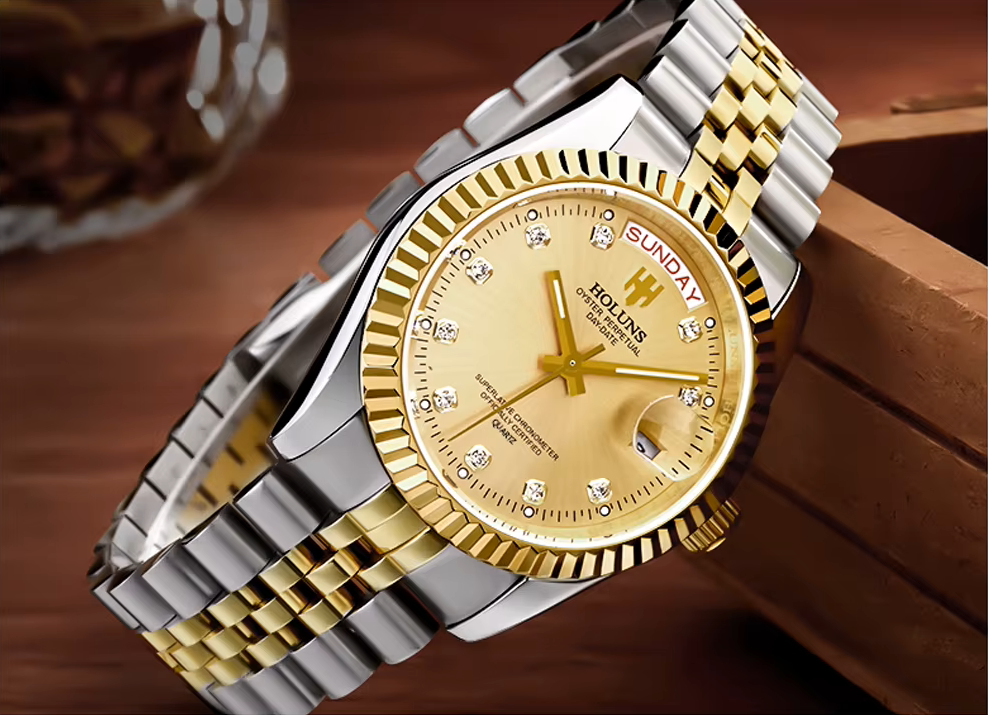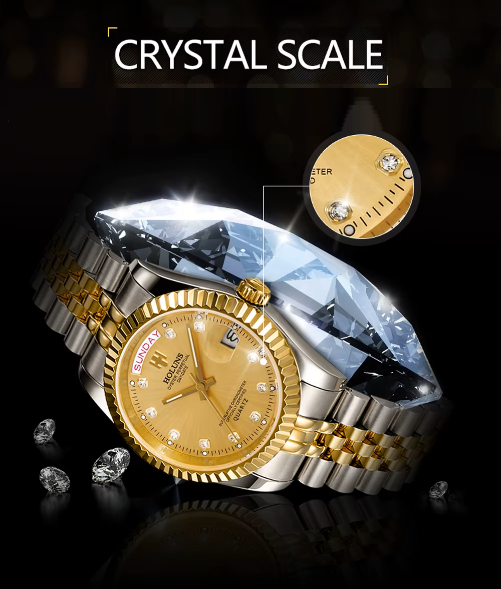 Elevate your style with the HOLUNS Men’s Luxury Quartz Watch, a refined timepiece designed for those who appreciate classic sophistication and modern functionality. Featuring a radiant gold dial adorned with diamond-like hour markers, this watch combines elegance with everyday practicality.