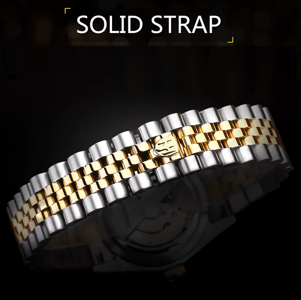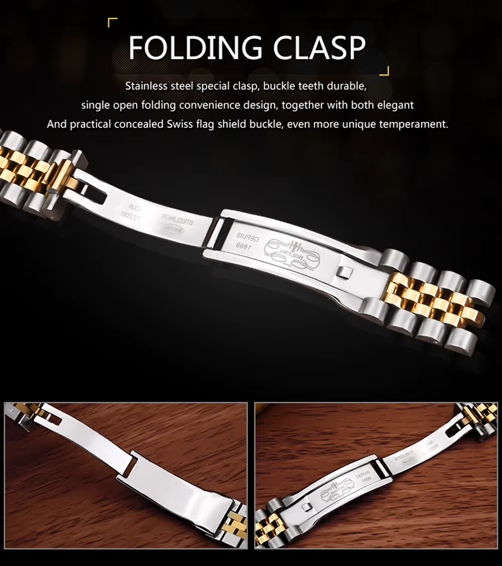 - Stainless Steel Band: Two-tone silver and gold Jubilee-style bracelet with solid clasp.