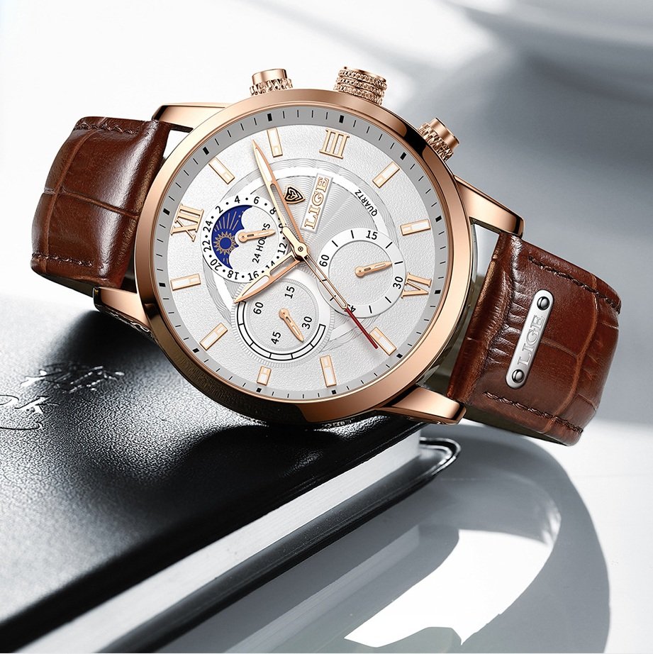 Elevate your style with the LIGE Men’s Luxury Chronograph, a timepiece that blends precision engineering with bold elegance. Designed for the modern professional, this multifunction watch features a moon phase indicator, 24-hour sub-dial, and chronograph functionality—all housed in a refined alloy case with a mineral tempered glass mirror.