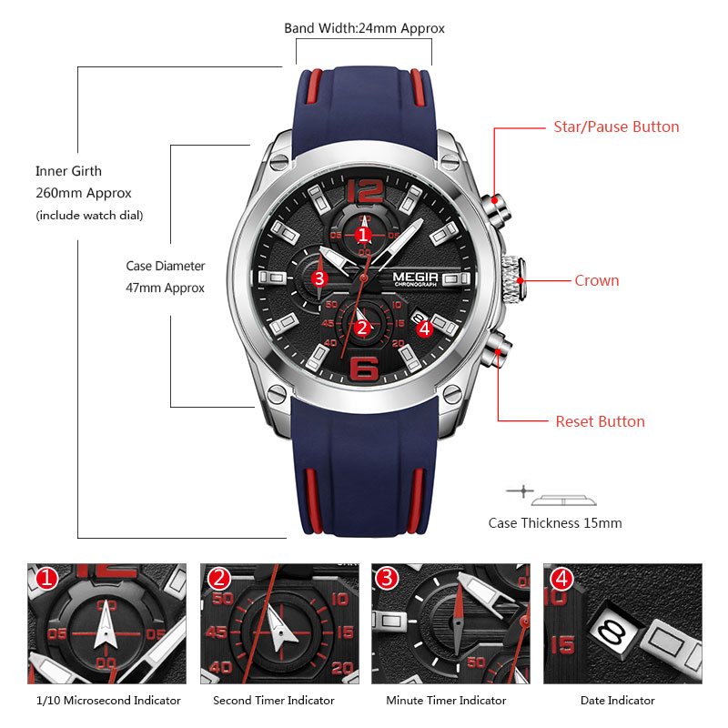 Command attention with the MEGIR M2063G-2 Men’s Chronograph Watch—a bold, precision-crafted timepiece built for performance and style. Featuring a rugged alloy case and a comfortable silicone strap, this watch blends sport functionality with everyday versatility. Waterproof Quartz Watch with Date Stamp and Glow-in-the-Dark Hands.