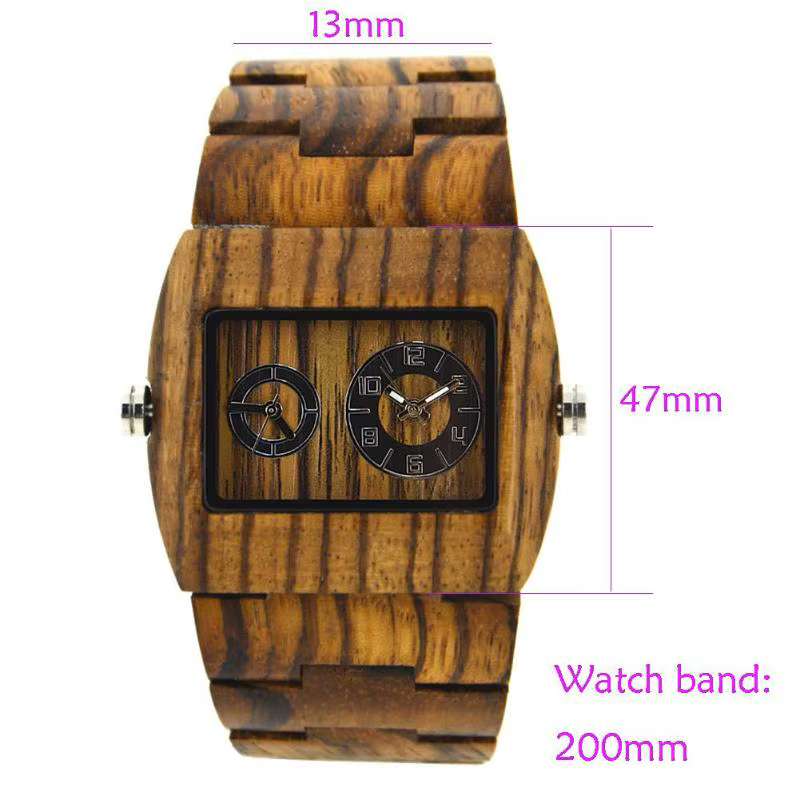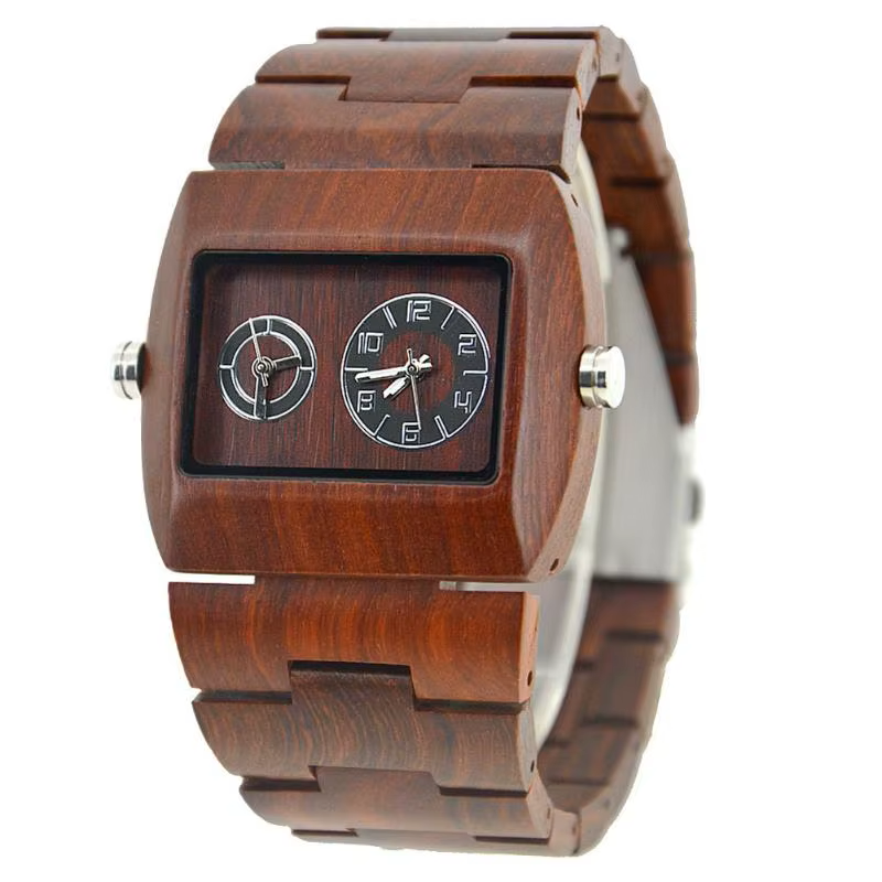 Crafted for the modern minimalist, this dual-display wooden wristwatch blends natural elegance with precision engineering. Featuring a rectangular face with two distinct dials, this timepiece offers a unique aesthetic and reliable quartz movement. The handcrafted sandalwood band and casing showcase rich grain patterns in four distinct styles: red sandalwood, ebony, maple, and zebra wood grain.