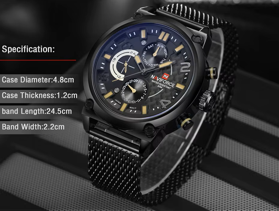 Bold. Tactical. Timeless. The NAVIFORCE NF9068 is a rugged yet refined timepiece designed for men who value precision, durability, and style. With its military-inspired design and multifunctional dial, this watch delivers both performance and presence—whether you’re in the office, outdoors, or on the move.