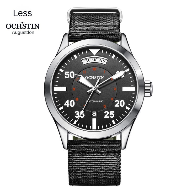 Precision meets rugged elegance in the OCHSTIN Master Series 62028B. This automatic mechanical watch is built for business and adventure alike, featuring a luminous dial, dual calendar display, and a durable nylon strap. With its transparent case back and onion-style crown, it blends classic craftsmanship with modern functionality.