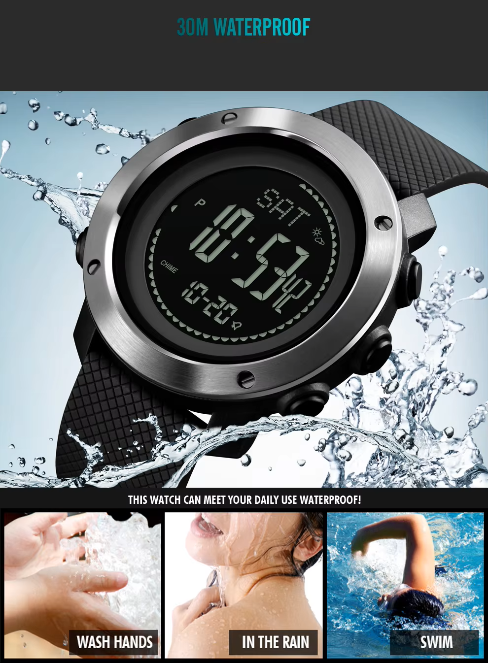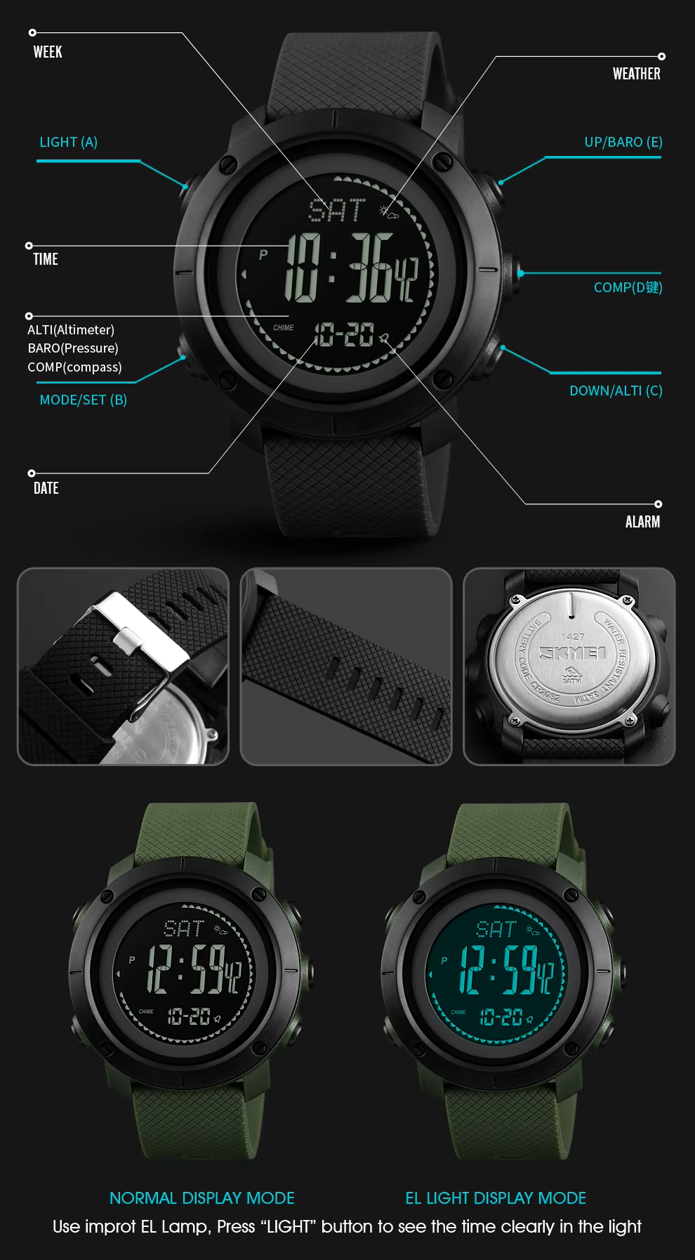 Conquer every terrain with the SKMEI 1427 – the ultimate multifunctional digital watch built for climbers, hikers, and outdoor adventurers. Engineered with precision sensors and rugged materials, this watch delivers real-time environmental data and reliable performance in extreme conditions.